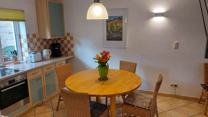 Die moderne Küche ist mit allen Geräten inkl. Geschirrspüler, Kaffeemaschine, Toaster, Wasserkocher und Mikrowelle ausgestattet. Im Kühlschrank befindet sich ein Gefrierfach.