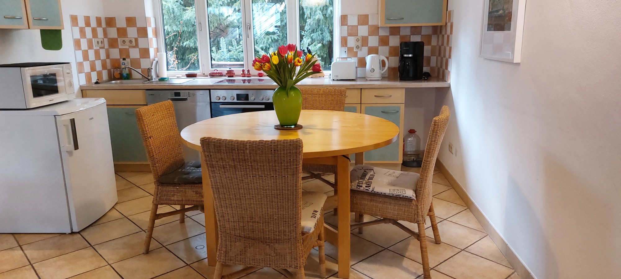 Die moderne Küche ist mit allen Geräten inkl. Geschirrspüler, Kaffeemaschine, Toaster, Wasserkocher und Mikrowelle ausgestattet. Im Kühlschrank befindet sich ein Gefrierfach.